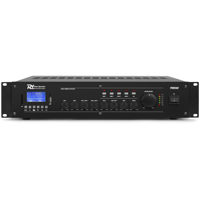 Destaca por su versatilidad multimedia, ya que integra un reproductor MP3 mediante USB y SD, conectividad Bluetooth para streaming inalámbrico y radio FM. Su diseño de rack de 19" y su robustez lo convierten en el núcleo ideal para tiendas, restaurantes, centros deportivos y naves industriales que requieren un sonido nítido tanto para música de ambiente como para avisos por voz.