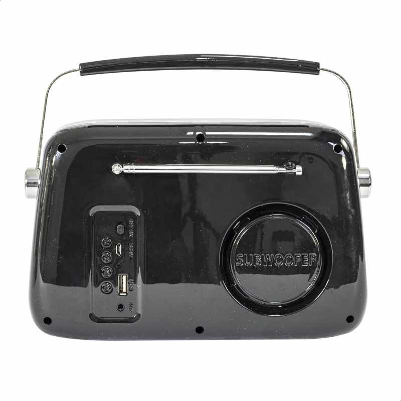 Radio portátil de diseño, recargable por USB. Bluetooth, USB, AUX y FM. Potencia de salida: 30W. Color Negro.