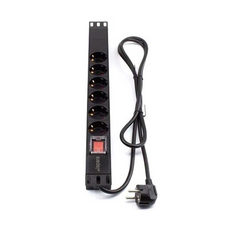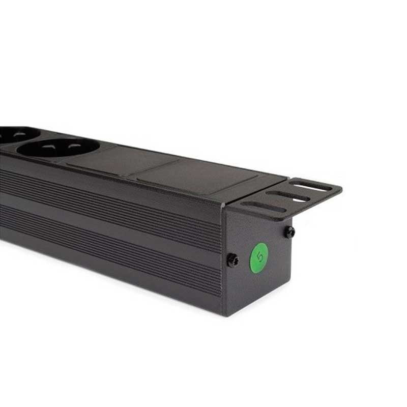 Especialmente diseñada para ser instalada en un armario Rack gracias a sus cogidas en los extremos para atornillar, pero también se puede usar de forma independiente. Cuenta con 6 tomas tipo schuko de 16A con interruptor con tapa de seguridad proporcionando una tensión eléctrica adecuada y segura a los equipos que integran un sistema dentro de armario rack estándar de 19".