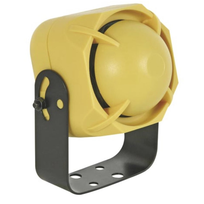 Sirena resistente a la intemperie, tono modulado, 6-14 VCC, IP44, 108 dBA, soporte de montaje incluido.