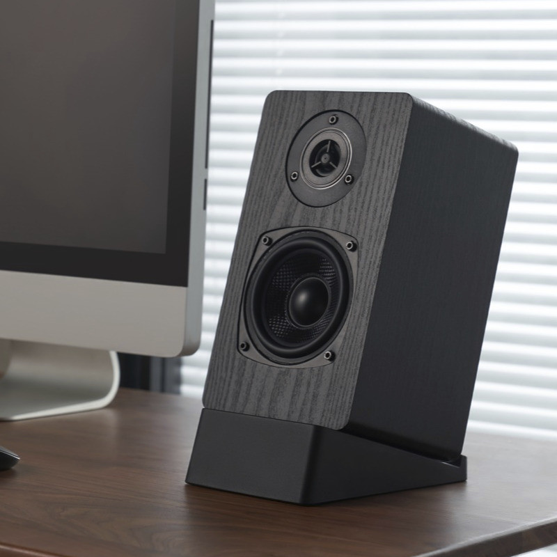 Este modelo está diseñado para elevar e inclinar los altavoces de escritorio hacia la posición de escucha ideal. Su inclinación fija de 15 grados permite que el sonido se dirija directamente a los oídos, mejorando la respuesta en frecuencias altas y la imagen estéreo. Al ser de caucho termoplástico, no solo evita que los altavoces se deslicen, sino que también protege la superficie del mueble y reduce las resonancias estructurales.