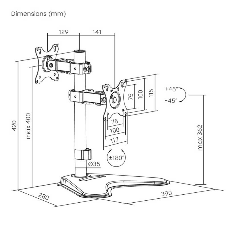 Soporte de mesa inclinable y rotable para 2 monitores/POS (1 pivotes, 2 brazo) de 17 a 32 pulgadas. Fabricado con acero de alta resistencia y pintado con pintura electrostática para un acabado perfecto. Estilo sobremesa, no se necesita anclar el soporte en el tablero de la mesa.